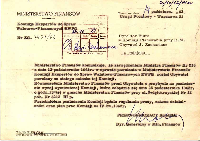Appointment to Finance Ministry's Expert Advisory Commission on Monetary-Financial Matters, 1962