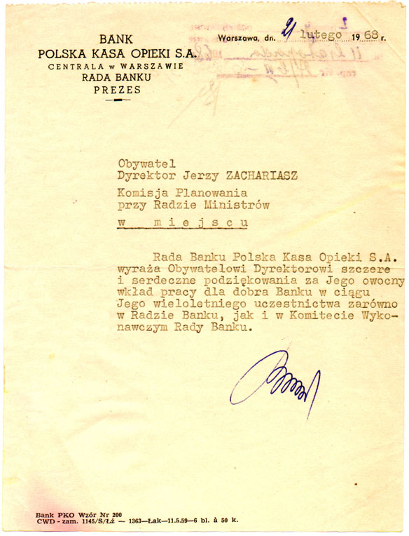 Certificate of accomplishment from the Board of Directors of Polish National Bank, 1968